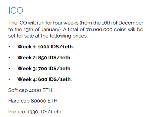 Speaking of main crowd sale, it will last at least for four weeks. Speaking of price, for 1 ETH you will get at the beginning 1000 IDS tokens. As time is passing the price is rising, so you better join early. Look at the picture below to see which bonuses they offer:
