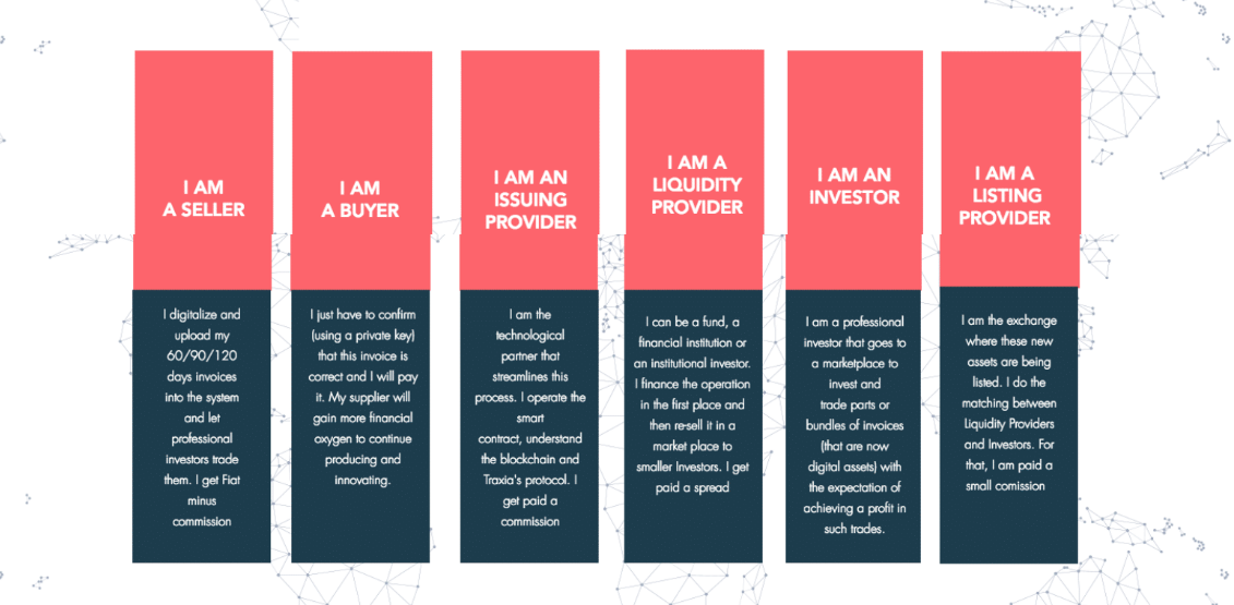 In our ecosystem Sellers upload their invoice, Buyers approve it with their private key, Issuing Providers convert it into a smart contract, Liquidity Providers assure the liquidity, Listing Providers manage the marketplace and Investors trade the newly created digital assets